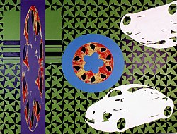 Geometrische schemas en kleurvlakken worden gecombineerd met decoratieve patronen waardoor ze met elkaar versmelten tot een nieuw geheel.